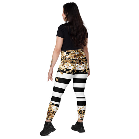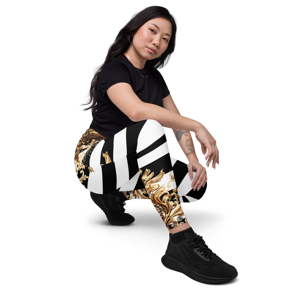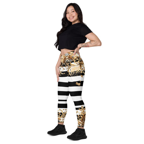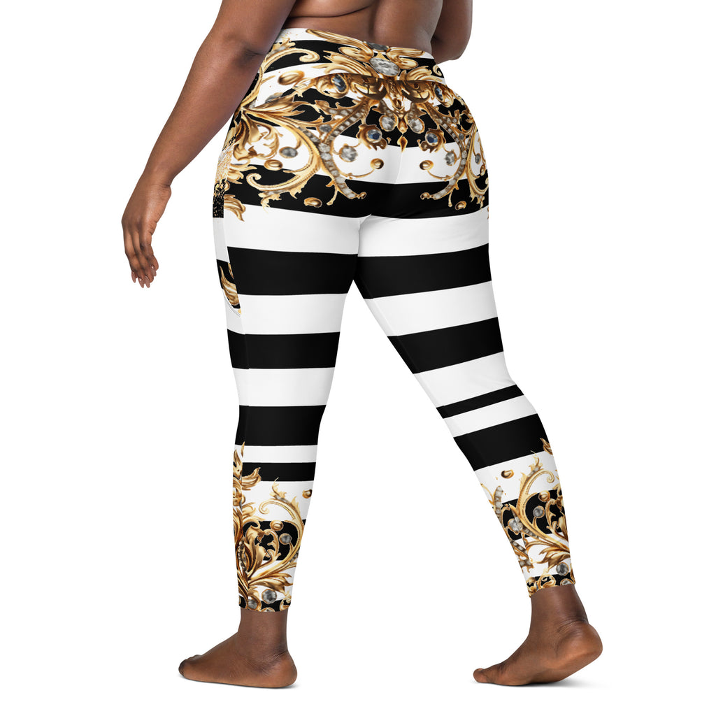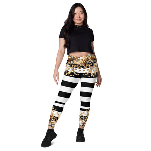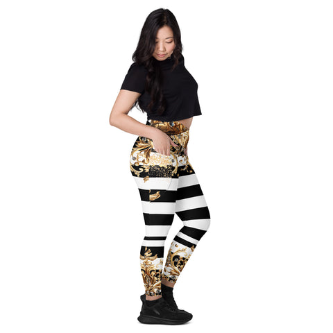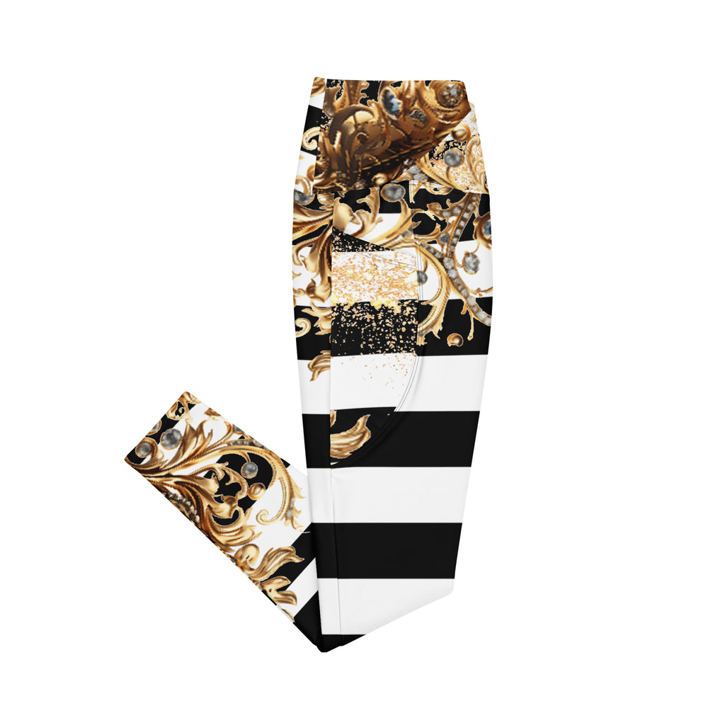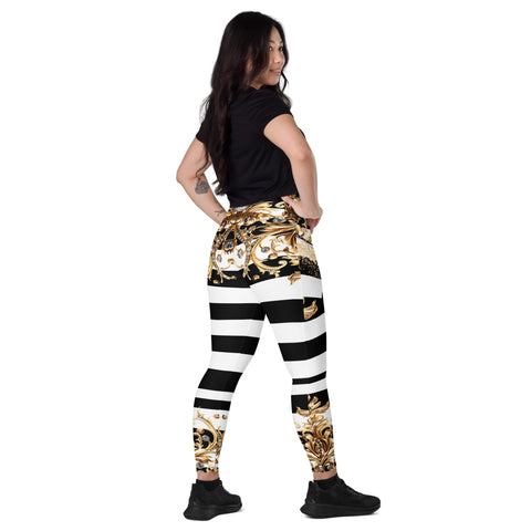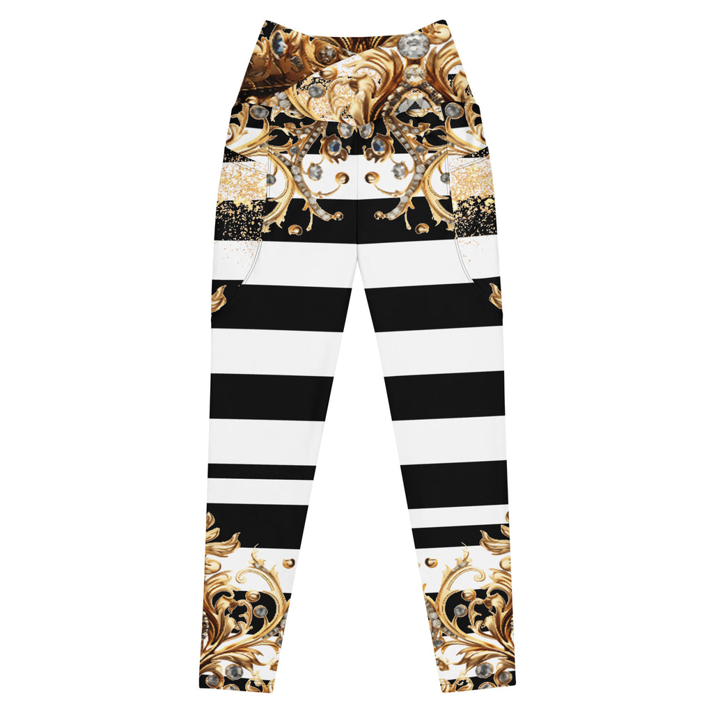 Luxury meets performance. Step into the spotlight with the Queen Of Extravagance Crossover Leggings With Pocketsβ€”designed for women who want style, comfort, and functionality all in one. With a bold gold royal design paired with sleek black-and-white stripes, these leggings are more than activewearβ€”they’re a statement.